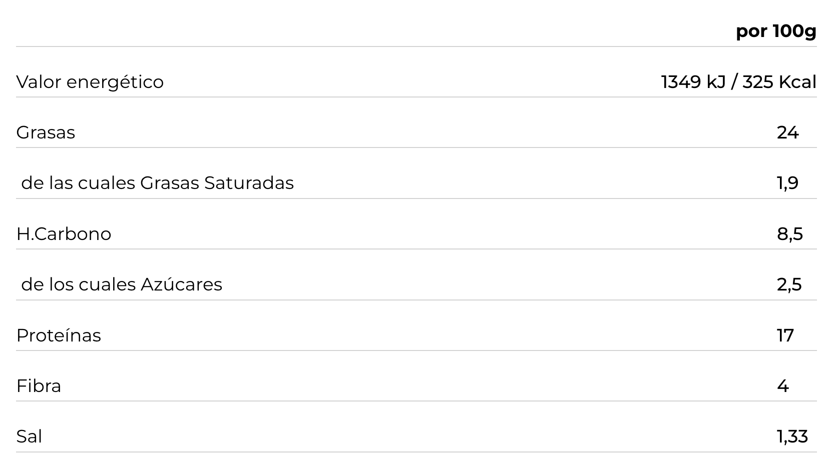 Es Sin Gluten, con un 17% de proteína, con 0% Azúcar Añadido Y baja en carbohidratos. Además, no necesita refrigeración porque está envasada en atmósfera protectora para que te dure varios meses en la despensa.